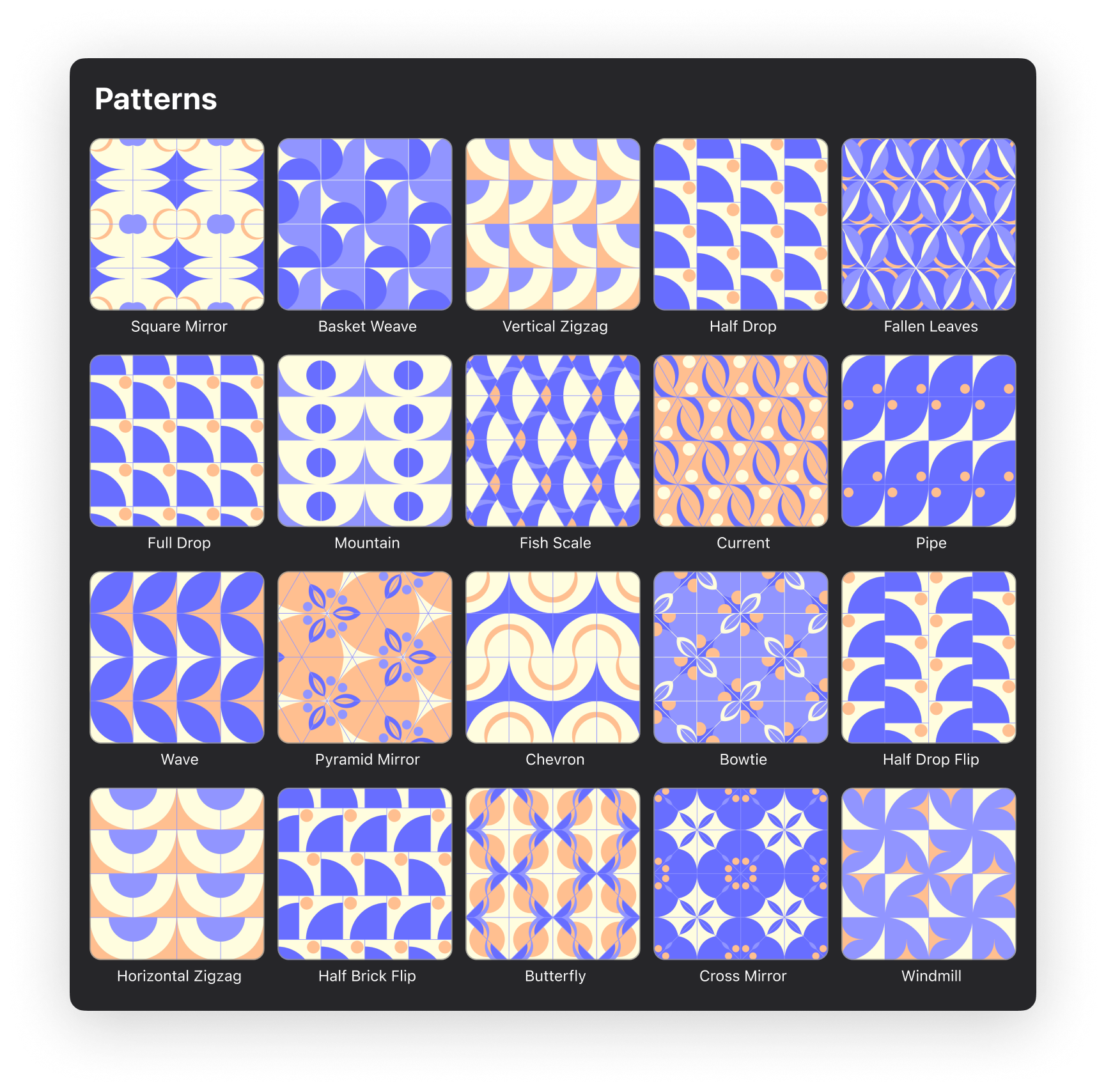 Access all standard repeat methods plus exclusive tilings. We're constantly adding new options to expand your creative possibilities.